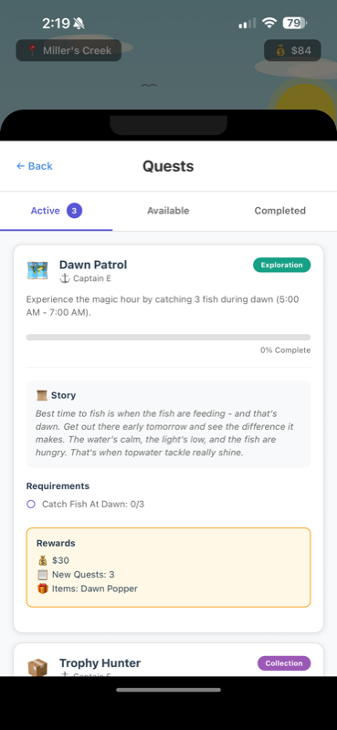 Quests in Hooked: Crestwater Bay teach you fishing fundamentals while unlocking new gear, locations, and challenges. Captain E will guide you through a series of quests that reward you with currency, shop unlocks, and story progression.